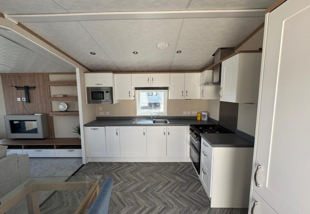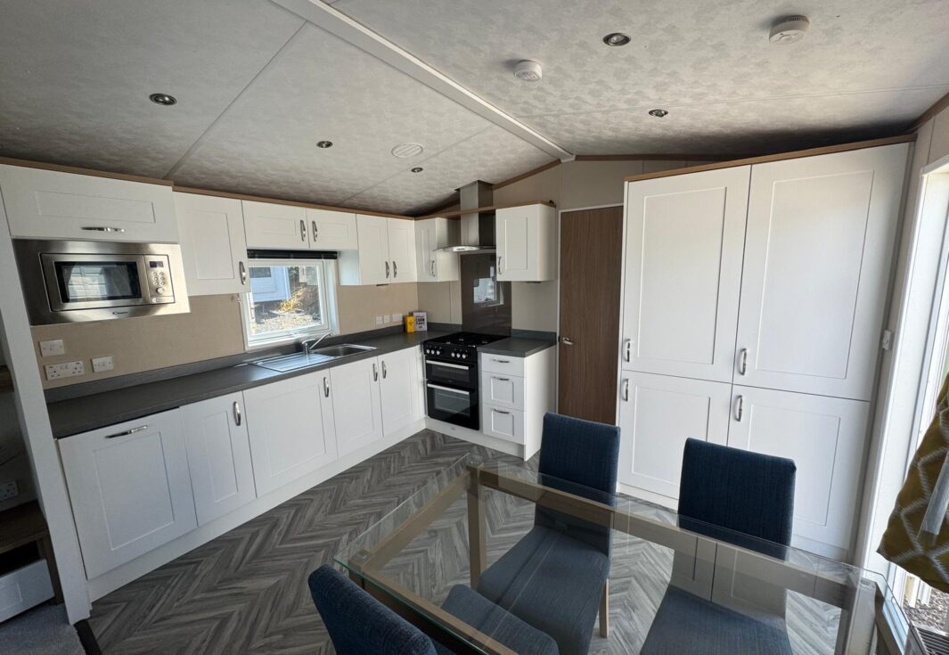Inside, the light-filled lounge boasts contemporary furnishings, a spacious seating area, and large windows that frame your surroundings. The fully fitted kitchen features modern appliances, ample worktop space, and a dining area ideal for relaxed meals or entertaining.